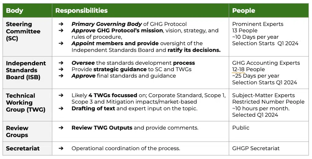 We are currently in a critical phase of the review process, as the GHG Protocol has recently opened up calls for applicants, closed on January 15, 2024, to the major working groups and governing bodies of the protocol. Here’s a summary of the responsibilities and roles of each part of the protocol: