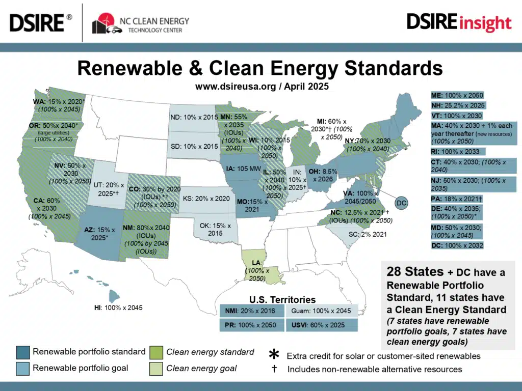 Renewable Portfolio Standards (RPS) and Clean Energy Standards (CES) are some of the more common policies states have implemented to drive clean energy deployment. These policies typically require a specific percentage of electricity sales from utilities in the state to be either renewable or zero-carbon. They range in ambition between standards and goals, can be quite modest, as with Ohio’s 8.5% renewable standard by 2026, or fairly ambitious, with Oregon’s 100% clean standard by 2040, and can differ on what resources qualify.