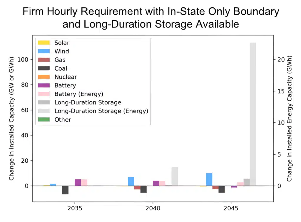 When a tighter geographic boundary for sourcing clean electricity is implemented, it can incentivize advanced decarbonization technologies such as long-duration energy storage (LDES). Enabling the deployment of this new technology will have local economic impacts as projects are deployed in Minnesota and can support deep, local decarbonization while keeping costs low: “Long-duration storage can be critical for cost-effectively eliminating fossil generation, and here cuts the cost premium of 100% in-state hourly matching in half from $33/MWh to $17/MWh.”