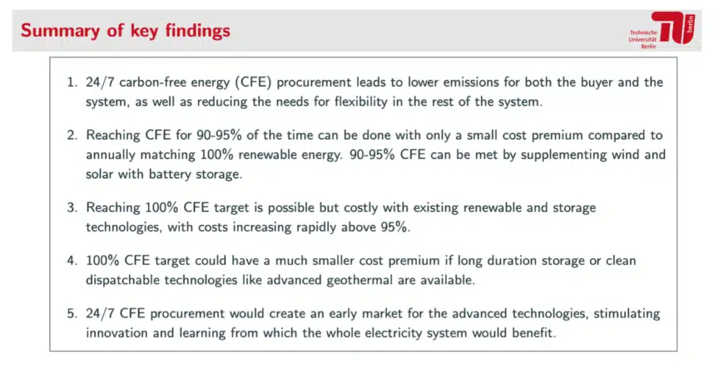 Many studies have examined the cost premium of high levels of hourly matching compared to 100% Annual Matching. For example, this study from TU Berlin provides detailed analysis of the cost premiums for various technology scenarios in 2025 and 2030 for Germany, Denmark, and Ireland. They draw a number of critical conclusions, that are replicated in other studies: