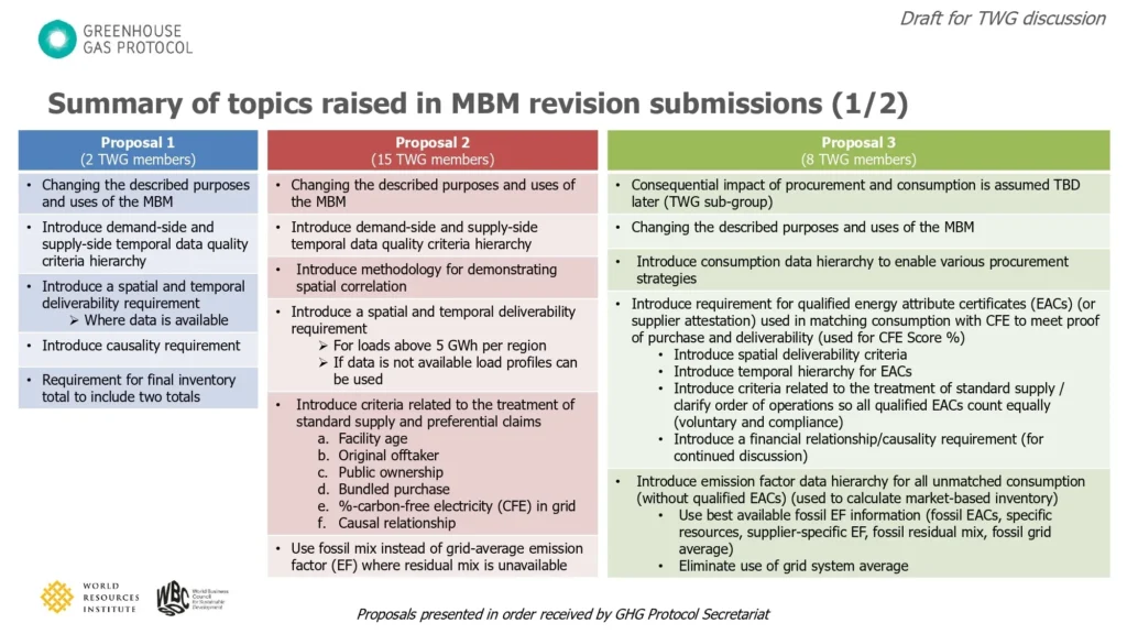 Based on the five options present above, TWG members with common interests grouped together to develop more detailed proposals, three of which are summarised above, with the three others described in the slides. Proposals 2 and 3 (the ones with by far the most support) outline detailed revisions to the market-based method, emphasizing a shift toward more granular, accurate accounting while building in key flexibilities. Both proposals introduce robust hierarchies for both demand- and supply-side temporal data quality.
