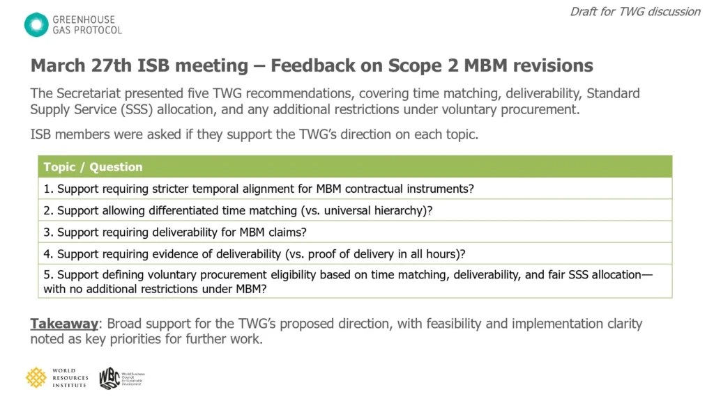 Turning to the Independent Standards Board (ISB), which has approval responsibility over the TWG proposal for the Scope 2 standard, we see broad support for the TWG’s proposed direction of travel (i.e., stricter temporal alignment, deliverability, and standard supply service) with feasibility and implementation clarity noted as key priorities for further work.