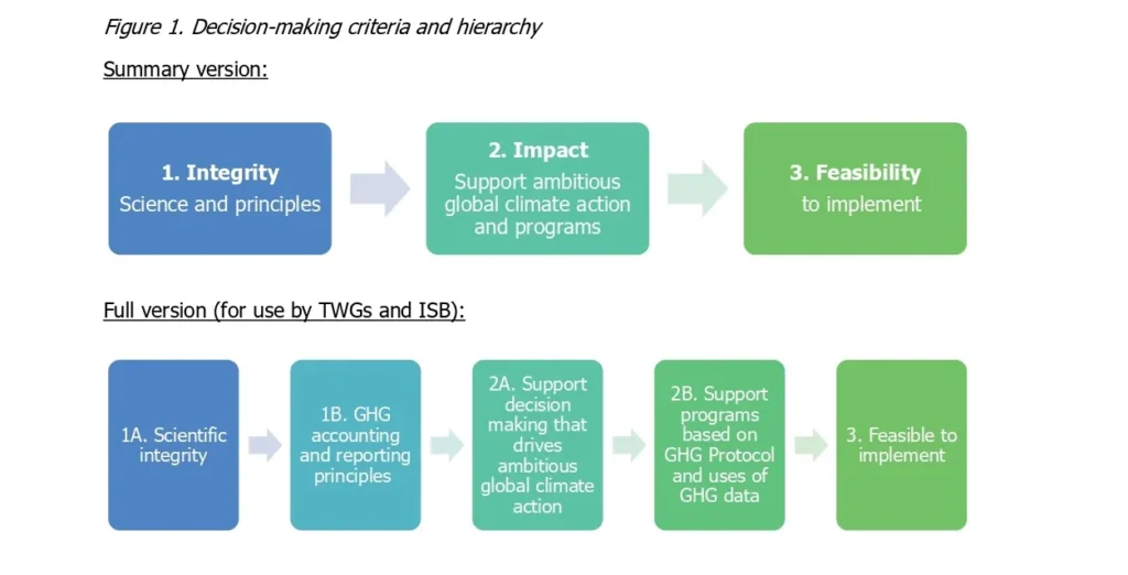 Crucially, the GHG Protocol Governance states that “The criteria are ranked in a hierarchy to aid in decision making. When options present tradeoffs between criteria, the hierarchy should be generally followed, such that, for example, scientific integrity is not compromised at the expense of other criteria, while aiming to find solutions that meet all criteria.”