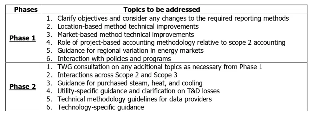 The Scope 2 update is being tackled in two phases. Phase 1 addresses the core structure and integrity of Scope 2 reporting, including clarifying the objectives, refining both location-based and market-based methods, and exploring how project-based accounting fits into Scope 2. It also aims to provide guidance for regional energy market differences and how Scope 2 interacts with existing policies and programs. Phase 2 will follow up on any unresolved Phase 1 issues and expand into broader technical areas, such as interactions between Scope 2 and Scope 3, accounting for purchased steam, heat, and cooling, and utility-specific topics like transmission and distribution losses. It will also provide methodology guidance for data providers and technology-specific considerations.
