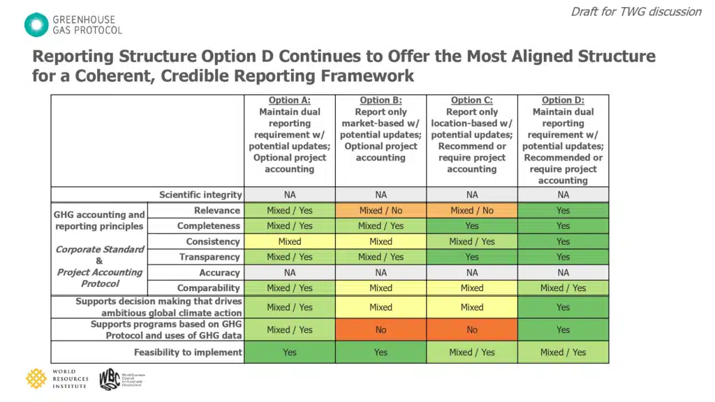 One of the most fundamental decisions in the update process is how the overall reporting framework should be structured. The GHGP Secretariat has presented four options, ranging from maintaining the current dual reporting structure to introducing more project-based or refined market methods. The Secretariat’s assessment of how each reporting option aligns with the decision-making criteria identified Option D as the most aligned, receiving consistent “Yes” ratings across key criteria — a view supported by the majority of the TWG. This would see dual reporting of location and market-based Scope 2 inventory numbers remain required, with a potential recommendation or requirement for a third “project accounting” number outside of the Scope 2 inventory. Details still need to be provided about how exactly the project (or “consequential”) accounting number would be calculated. Consequential accounting guidance is being developed by a consequential accounting sub-group of the Scope 2 TWG, and more details are available in the document repository.
