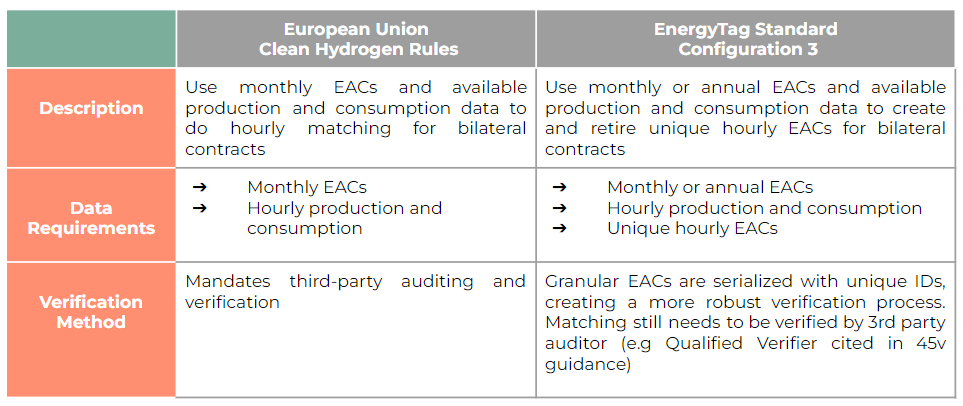 However, the exciting reality is that existing EACs and electricity data makes hourly matching an administrable feature of policies today. Policymakers can adapt their own rules in at least two different ways: reflect Europe’s rules outlined in their clean hydrogen production definition or adopt EnergyTag’s Standards and enable the Configuration 3 system.