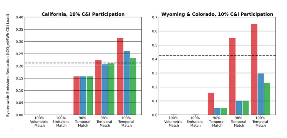 “Our results suggest that annual volumetric and emissions matching are not sufficient to achieve additional renewable energy generation and reduce system emissions compared to a baseline without a REC market. On the other hand, we find that hourly matching results in additional renewable energy generation and emissions reductions in all cases.”