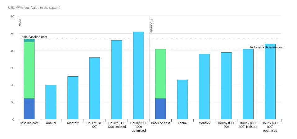 The International Energy Agency has also done modelling of hourly matching for India and Indonesia, finding that “the system value of annual matching portfolios is substantially below the cost to serve the corporate load with standard grid supply. In contrast, hourly matching portfolios bring a much higher value, which may even exceed the costs for serving the corporate load.” This is crucial for regulated markets, which dominate in the global south, to ensure that the public does not have to cover the system costs not covered by annual matching.