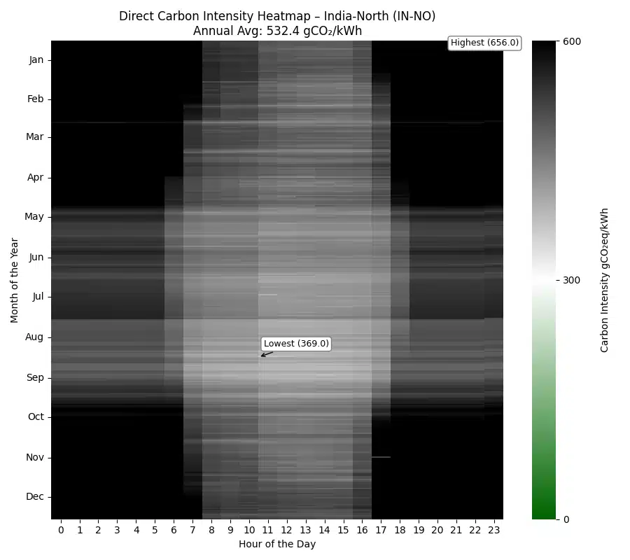 - Regional Characteristics (India): India’s Northern grid is heavily fossil-based, with a carbon intensity range of 369-656 gCO₂/kWh and some mild variation across the day, making the maximum 1.8 times higher than the minimum. There are cleaner periods during solar output, particularly during summer days, but no hours come close to truly clean electricity supply, with coal the dominant source of electricity at night throughout the year.