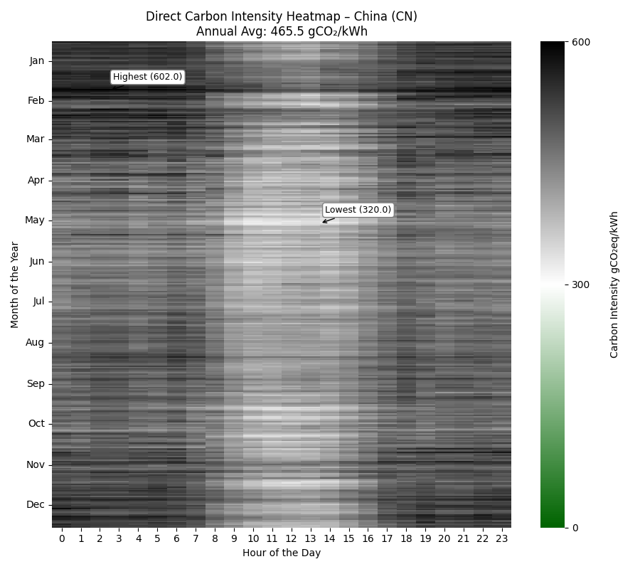 - Region Characteristics (China): China displays moderate variability, with the highest hourly carbon intensity about 1.9 times higher than the lowest (602 → 320 gCO₂/kWh). Fossil generation dominates the system, but solar is starting to impact midday carbon intensity, especially in spring and summer. We see the presence of hydro and wind also, eating into night-time coal generation.
