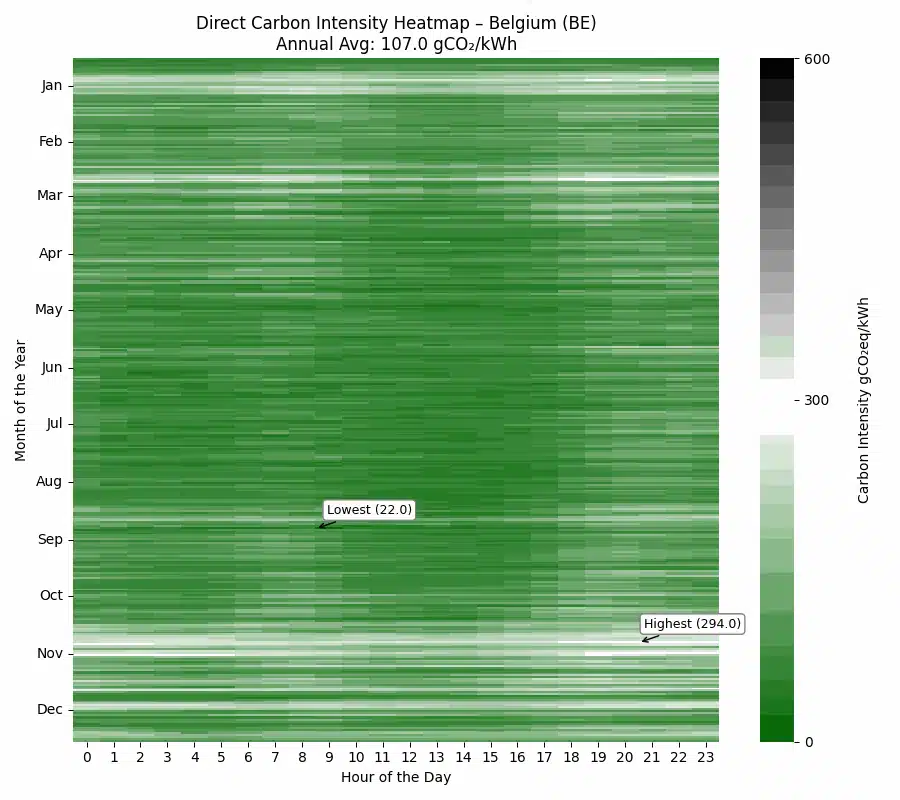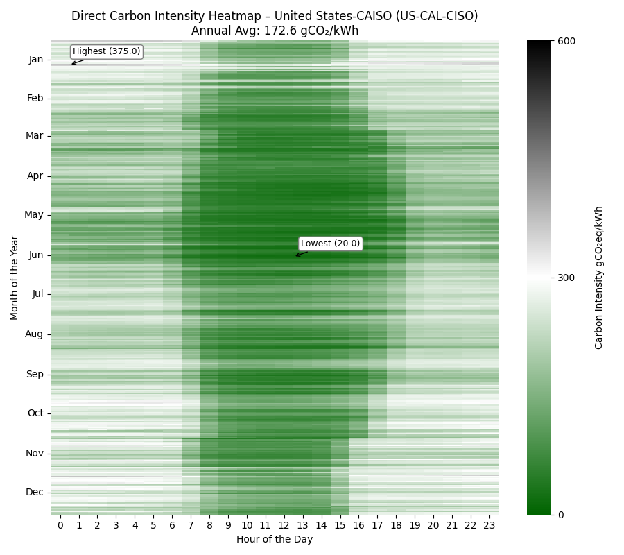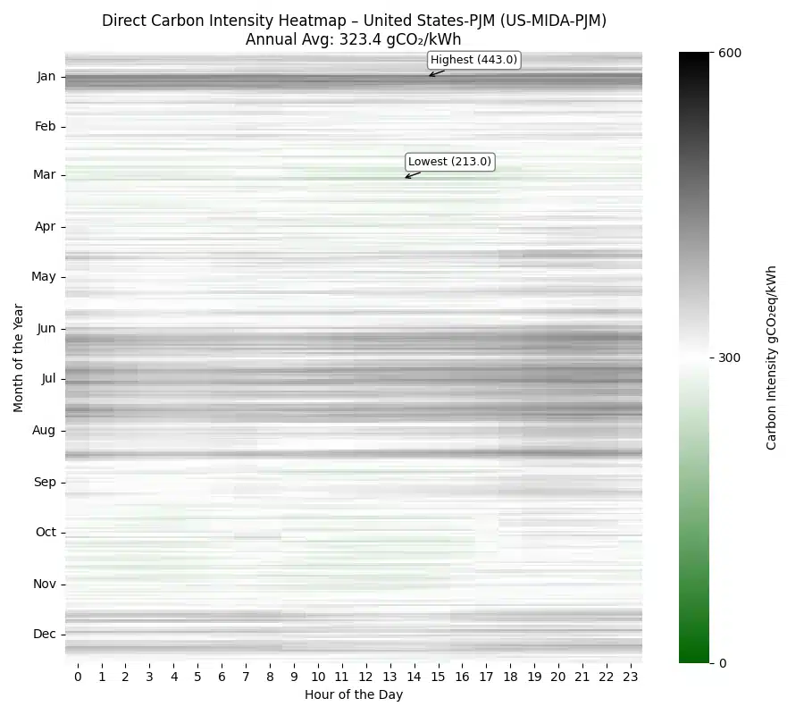 - Region Characteristics (United States): The PJM grid in the United States is less carbon-intensive; however, it still reflects a significant reliance on gas (as opposed to coal in China and India) throughout the year. The grid’s maximum carbon intensity is around 2.1 times greater than its minimum. The region has significant nuclear power production, which draws down the overall grid intensity, but a lack of renewables means gas remains the most significant source of power in most hours.