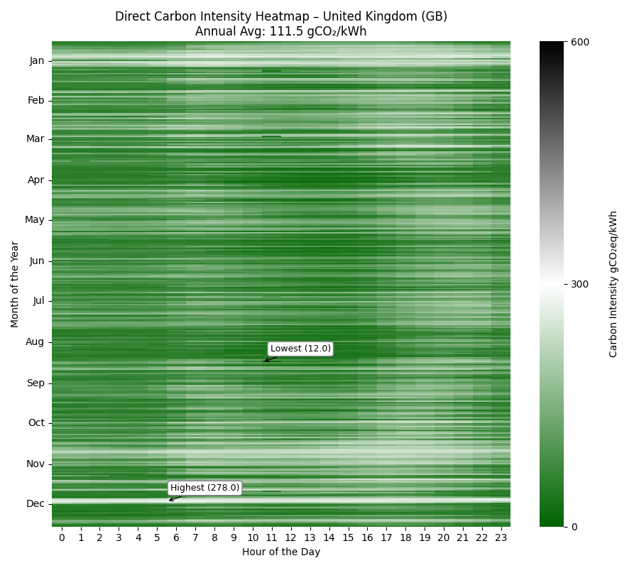 - Region Characteristics: The United Kingdom shows notable hourly variability in carbon intensity, with maximum carbon intensity 23 times higher than minimum. The significant role played by wind power is demonstrated, with very clean electricity in many hours of the year, particularly in certain winter weeks. Solar penetration is growing, and this shows during summer. However, the role of gas is also noticeable at times when wind and solar output are low. The grid’s average is considerably lower than other grids analyzed above.