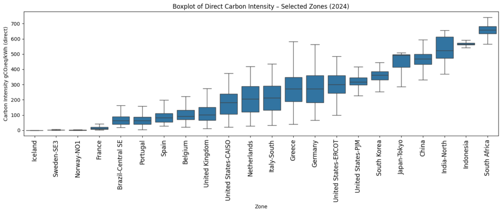 The box plots (showing the mean, interquartile range, and min/max values) below give a comparative overview of the carbon intensity for certain key zones. We see clearly, the renewable heavy regions like Germany, ERCOT, or CAISO have large variance, making hourly accounting all the more important.