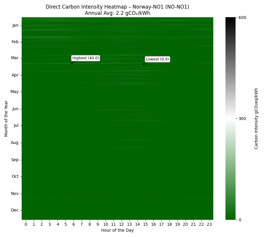 - Region Characteristics (Norway): Norway’s NO1 grid has near-zero carbon intensity 24/7, this is thanks to abundant hydropower and relatively small demand. The maximum carbon intensity is only 40 gCO₂/kWh, and the minimum goes all the way to 0 gCO₂/kWh. The average carbon intensity in 2024 was just 2.2 gCO₂/kWh — one of the cleanest grids globally.