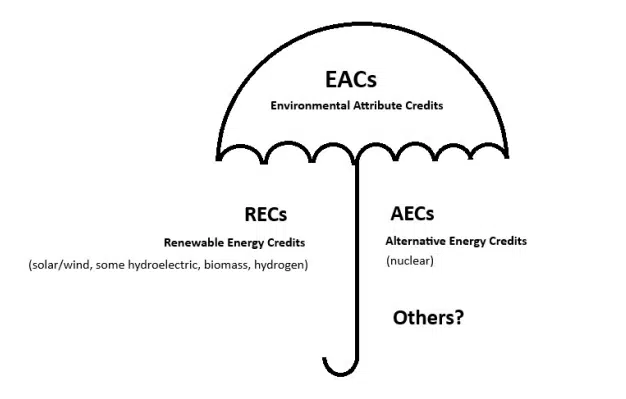 EACs are often used as the basis for exclusive claims to one unit of clean electricity because they represent a contractual instrument unique and singular to a given volume of generation. For clarity, the Minnesota PUC offers this helpful visual for thinking about EACs as the umbrella term for a few different types of attributes, depending on the type of generation that created the certificate, which can include renewable attribute certificates and alternative energy certificates.