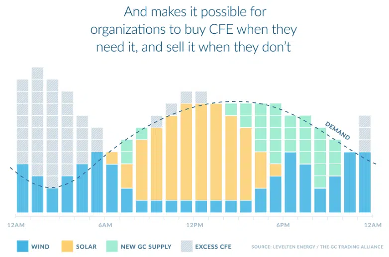 This graphic from LevelTen Energy shows how granular certificates (GCs) – hourly EACs – provide investment signals for carbon-free energy (CFE) to fill the gaps in demand left by wind and solar, in addition to allowing entities to sell excess CFE generation they may have.