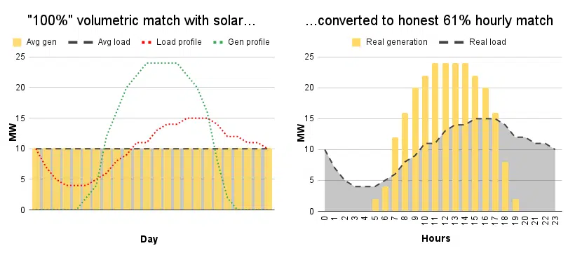 “Volumetric” annual matching functionally allows companies to offset nighttime fossil fuel use by buying extra daytime solar somewhere else. New rules would require more honest hour-by-hour matching of clean energy for the largest companies, with “load profile” feasibility measures (shown above) enabling this on day 1 with no new data or contracts needed. Data that is hourly from the start is better – and rapidly growing in availability – but even this simple conversion is more accurate than current rules.