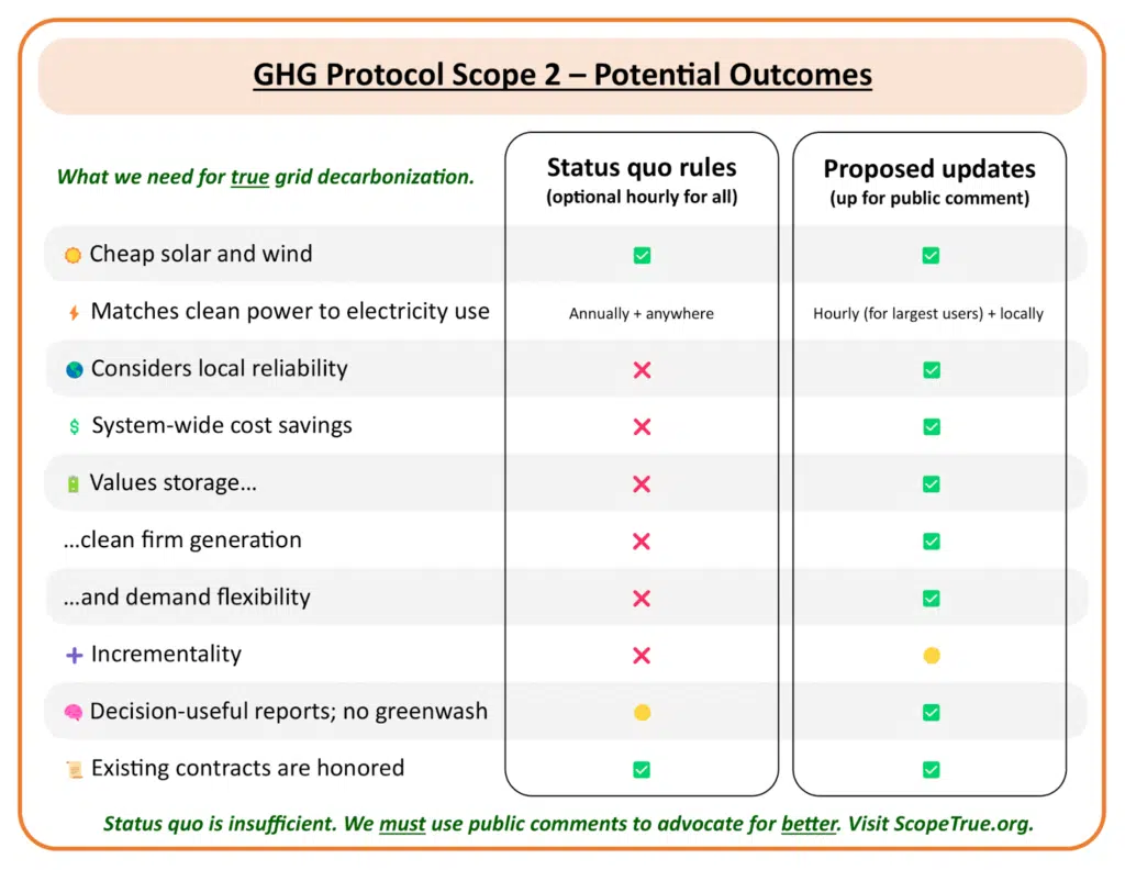 Do not be misled by claims that the GHGP Technical Working Group supports the proposed consequential framework more than the Scope 2 proposal. This is false, and public documentation from the GHGP shows (see Q12 on pages 3 and 5) that the vote referenced was simply to advance “continued development” of the metric, separate from Scope 2. That is what is happening, with maintained separation between “inventory” and “project” accounting and ongoing work to enable companies to effectively report both.